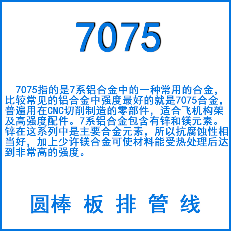 7075指的是7系鋁合金中的一種常用的合金,比較常見的鋁合金中強(qiáng)度最好的就是7075合金,普遍用在CNC切削制造的零部件,適合飛機(jī)構(gòu)架及高強(qiáng)度配件。7系鋁合金包含有鋅和鎂元素。鋅在這系列中是主要合金元素,所以抗腐蝕性相當(dāng)好,加上少許鎂合金可使材料能受熱處理后達(dá)到非常高的強(qiáng)度。