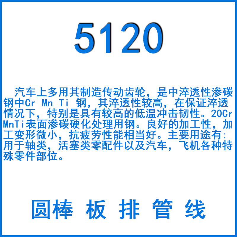 5120滲碳鋼,滲碳鋼通常為含碳量為0.17%-0.24%的低碳鋼。汽車(chē)上多用其制造傳動(dòng)齒輪,是中淬透性滲碳鋼中Cr Mn Ti 鋼,其淬透性較高,在保證淬透情況下,特別是具有較高的低溫沖擊韌性。5120表面滲碳硬化處理用鋼。良好的加工性,加工變形微小,抗疲勞性能相當(dāng)好。主要用途有:用于軸類(lèi),活塞類(lèi)零配件以及汽車(chē),飛機(jī)各種特殊零件部位。