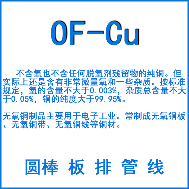 0F-CU無氧銅是不含氧也不含任何脫氧劑殘留物的純銅。但實際上還是含有非常微量氧和一些雜質。按標準規定,氧的含量不大于0.003%,雜質總含量不大于0.05%,的純度大于99.95%。根據含氧量和雜質含量,無氧銅又分為一號和二號無氧銅。一號無氧銅純度達到99.97%,氧含量不大于0.003%,雜質總含量不大于0.03%;二號無氧銅純度達到99.95%,氧含量不大于0.003%,雜質總含量不大于0.05%。